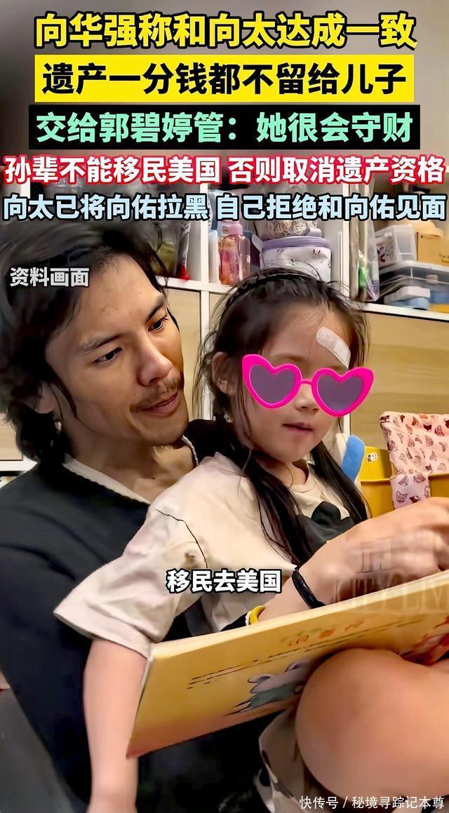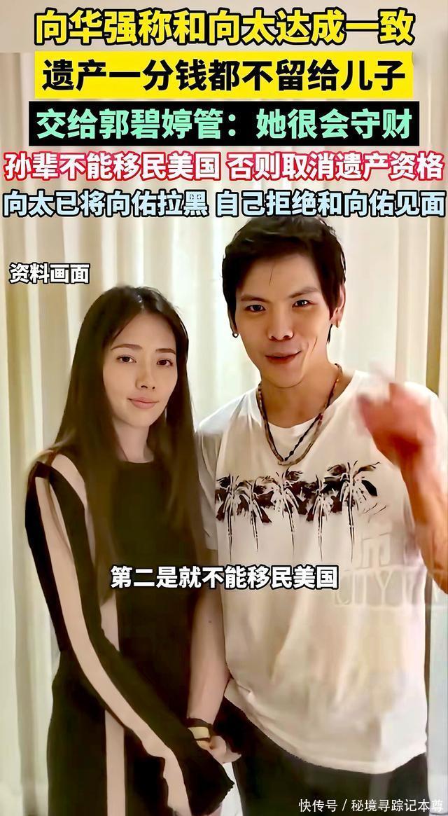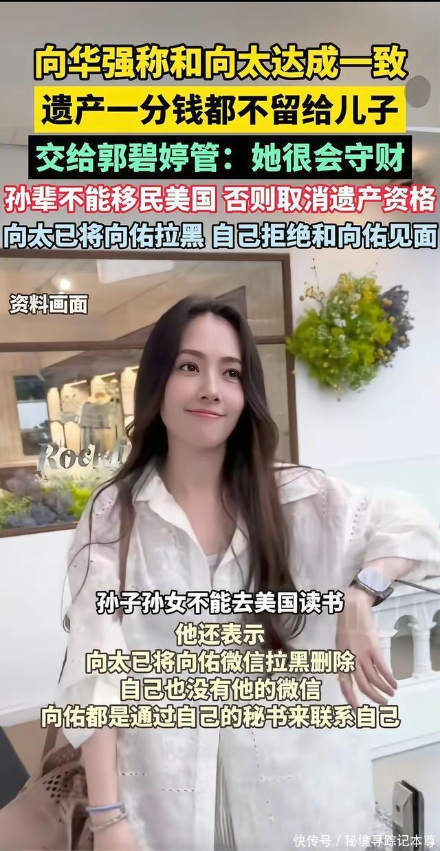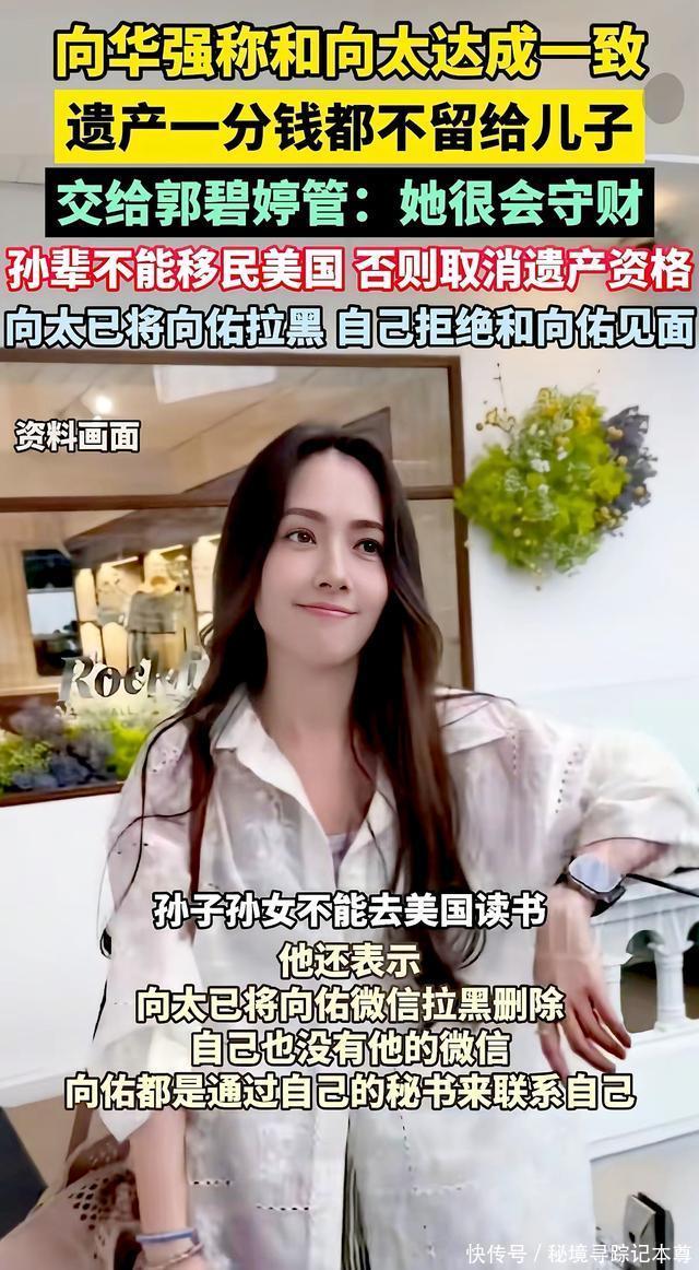 在阅读此文之前,辛苦您点击一下“关注”,既方便您进行讨论和分享,又能给您带来不一样的参与感,感谢您的支持! 向华强76岁了,前不久对着镜头说了句话,把在场的人都听愣了。 “每月领点生活费,不饿死就得了。” 说这话的时候,向太陈岚就坐在旁边,一句话也没接。 没人知道那一刻她心里翻腾的,是不是二十年前那个深夜,自己一边抹眼泪一边念叨“慈母多败儿”的模样。 百亿家产怎么分,表面看是分钱的事,说到底,不过是一个母亲用后半辈子的后悔,给天下当爹当妈的提了个醒。 消息一出来,网上立马炸了锅。 向华强亲口承认:他和向太名下那庞大的家产,一分钱都不直接留给两个亲生儿子。 所有的钱都放进家族信托基金里,好比存进了一个大保险箱,每个月只准取点零花钱。 保险箱的钥匙,交到了儿媳妇郭碧婷手里。 至于两个亲儿子,向华强就一句话:“每月领点生活费,不饿死就得了。” 有人说这太狠了,可仔细想想,哪是什么争家产?分明是两个快八十岁的老人,对两个儿子的未来操碎了心。 向太为什么这么做?咱们先看看这两个儿子这些年都啥情况。 大儿子向佐,长了一张硬汉脸,一心想往娱乐圈里钻。戏没少拍,功夫没少下,折腾了快二十年,演啥都差一口气。观众记不住他演的戏,就记住他是向华强的儿子。要说有多大出息,真说不上来。 可这在向太眼里,还算省心的。真正让她睡不踏实的,是小儿子向佑。 提起这个小儿子,向太有一回在直播间里,说着说着眼泪就止不住了。她说:“他是我的痛,慈母多败儿啊。” 这话一出口,不知道多少当父母的在屏幕那头跟着心酸。 向佑年轻的时候走过一段弯路,跟家里闹过不少矛盾。最出名的是早年间在外头惹了事,闹得挺大,最后吃了官司,全香港都知道了。 回来以后,班也不好好上,成天东游西逛,只有兜里没钱了才想起回家。 最让向太后怕的,是有一次因为钱的事在家里闹起来,把向太气得心脏病都差点犯了。那个架势,哪像是儿子跟妈要钱?活脱脱就是个讨债的。 向太红着眼眶说:“我后悔啊,后悔早年给钱太多,以为那是爱,结果把孩子惯坏了。 总以为一次次原谅能换来他回头,现在才明白,没有底线的原谅就是放纵,最后把孩子害了。” 这话听着扎心,可细想想,哪个当妈的没在孩子身上后悔过? 正是看透了两个儿子不是管钱的料,向华强和向太才做了一个让很多人想不通的决定:越过儿子,直接把钱交给儿媳郭碧婷。 为什么是郭碧婷?向太心里有杆秤:这儿媳妇不争不抢,不贪图虚荣,从来不乱花钱,把家里和孩子都收拾得妥妥帖帖。嫁进来这些年,没闹过啥幺蛾子,踏踏实实过日子。交给她,放心! 可你要是以为这就是简单分家产,那就小看向太的格局了。 遗嘱里还藏着一条硬杠杠——孙辈长大以后,教育必须在长辈眼皮子底下完成,不能重蹈覆辙当“脱缰的野马”。 按向家的想法,孩子得在长辈身边长大,这样既能看着他们走正道,也能随时提个醒,免得再走弯路。 说起这个,向太把话说得更透。她说这跟瞧不瞧得起哪儿没关系,关键是自家吃过亏。 小儿子向佑当年就是在国外留学时走偏的。那时天高皇帝远,家里想管也够不着。 他结交了一帮朋友,开始胡吃海喝、花钱如流水,学业也荒废了。慢慢地,人就变了,回国以后家里谁也管不住。 这段经历像根刺,扎在向太心里一直拔不出来。 “他一个人在那么远的地方,我们想管也管不到。眼睁睁看着他一步步走偏,我们心里那个悔啊。 所以现在我们坚持,孩子必须在自己身边长大,看着他们走正道,我们才能踏实。这是我儿子拿青春换来的教训,不能再错一回了。” 遗嘱的事传开以后,小儿子那边很快有了动静。 据说向佑得知消息后,电话一个接一个地打。可这回,向太和向华强都没心软。 电话那头再怎么着急,向太始终没接。后来听说向佑托人带话想约爸妈出来吃顿饭,老两口也是一句“没空”,直接挡了回去。 曾经那个无限包容儿子的母亲,这次用沉默给出了最后的答案——有些路,终究得自己走。 向华强接受采访时说:“向太跟他没有直接联系,他要找我,得先通过秘书转达。” 对着镜头,向华强又说了句话:“遗嘱早就立好了,但钱不能先分。原则就是让他们自个儿挣钱去!要是想躺着啥也不干,连每月那点生活费都不给!” 这话听着绝情,可细琢磨,满满的都是无奈。老两口都奔八十了,他们太明白一个理儿:留给儿子一座金山,不如给孙子留个靠谱的妈,再加一道不能躺平的紧箍咒。 看完向家这场风波,我倒生出几分敬佩。 见过太多有钱人家为了家产闹得不可开交——李兆基家、郭炳江兄弟,哪个不是亲骨肉翻脸?可在向华强和向太身上,我看到了另一种活法。 乍一看觉得老两口心狠,细想想才明白,这才是当爹当妈最难的那步棋。 第一,他们分得清啥是疼孩子、啥是害孩子。 多少当爹当妈的,总想着“我走了以后管他洪水滔天”,拼命给子女攒钱。结果钱反倒成了催命符,多少好端端的家,为了争家产打得头破血流? 你看向太,年轻时一门心思宠,最后换来“慈母多败儿”,这教训够不够疼?正因为自己疼过,才明白现在当这个恶人,逼儿子自个儿挣钱,才是真对他们好。 第二,他们守得住根。 现在多少人挤破头想把孩子送出国?向家偏偏反着来,拿巨额家产当赌注,硬性要求孙辈必须留在身边。 为啥?小儿子向佑就是活生生的例子——孩子要是离开父母眼皮子底下,没了